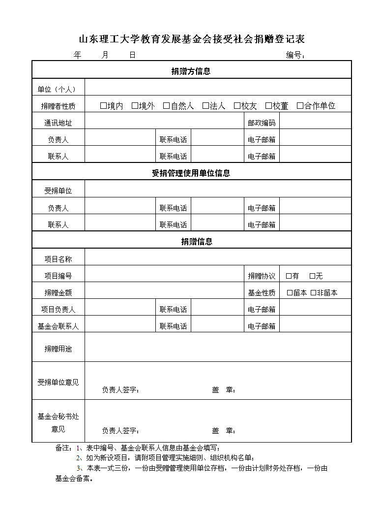 山东理工大学教育发展基金会接受社会捐赠登记表 2019-12-23 19:58:24 来源: 阅读次数:8,195 点击下载:山东理工大学教育发展基金会接受社会捐赠登记表 上一篇:捐赠协议(范本) 下一篇:山东理工大学教育发展基金会资金使用登记表