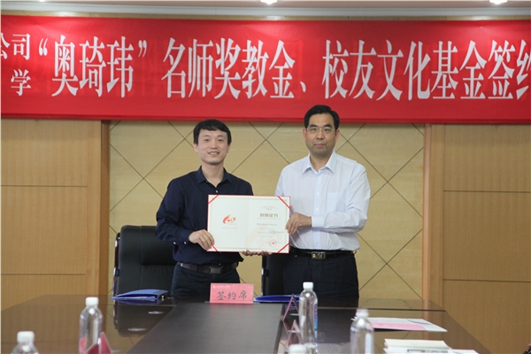孔令博、吕传毅代表双方签订了“奥琦玮”名师奖教金、校友文化基金协议。孔令博代表公司向学校捐资120万元人民币,吕传毅代表学校接受捐赠并向孔令博颁发了捐赠证书。