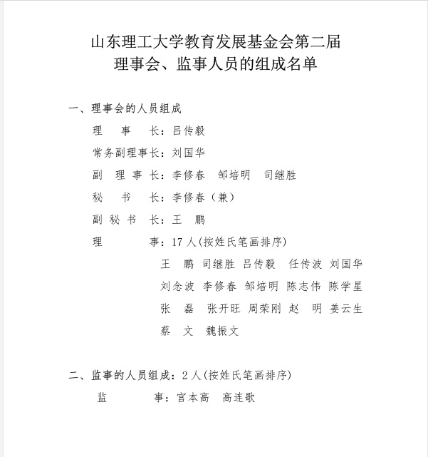 山东理工大学教育发展基金会第二届 理事会、监事人员的组成名单 2019-12-23 20:06:31 来源: 阅读次数:8,287 上一篇:山东理工大学教育发展基金会章程 下一篇:2021-2022学年合作发展处 信息公开工作年度报告